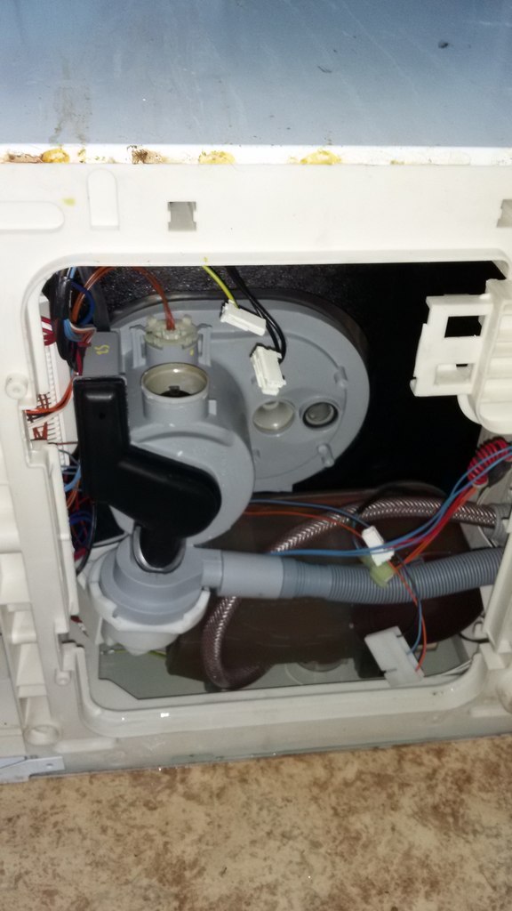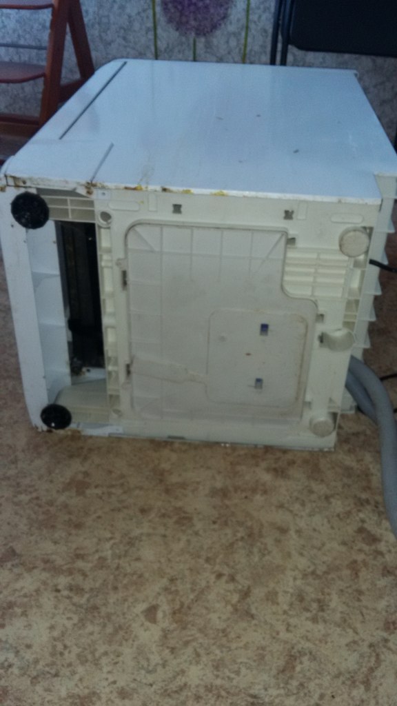 Нужное нам устройство находится под днищем посудомойки. Поэтому для отсоединения насоса действуем следующим образом: