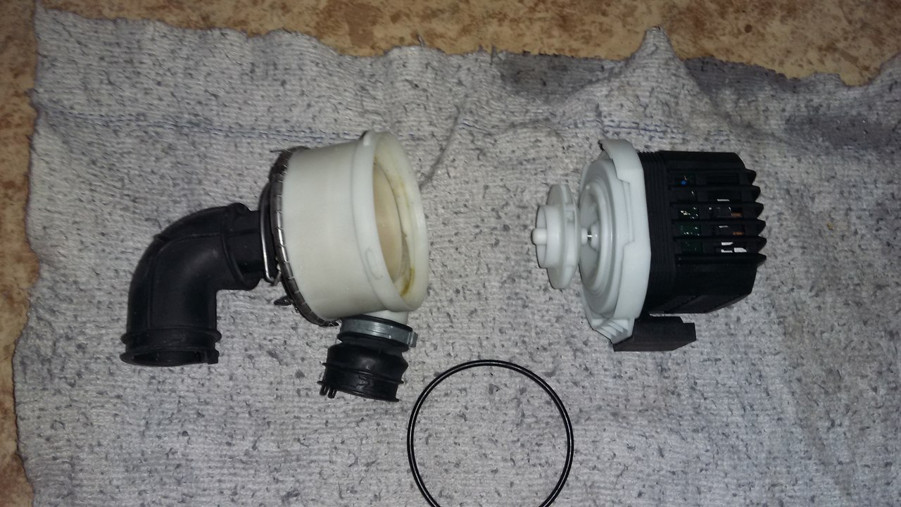 - Отсоединяем насос. Для этого надо отжать стопор, удерживающий его в улитке, и одновременно повернуть ЦН относительно улитки против часовой стрелки. Получаем полностью демонтированное устройство.